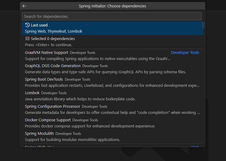 ๊ธฐ๋ณธ์ ์ผ๋ก๋ Spring Web, Lombok, Thymeleaf, Spring Boot DevTools ๋ฑ์ ์ ํํ๋ค.