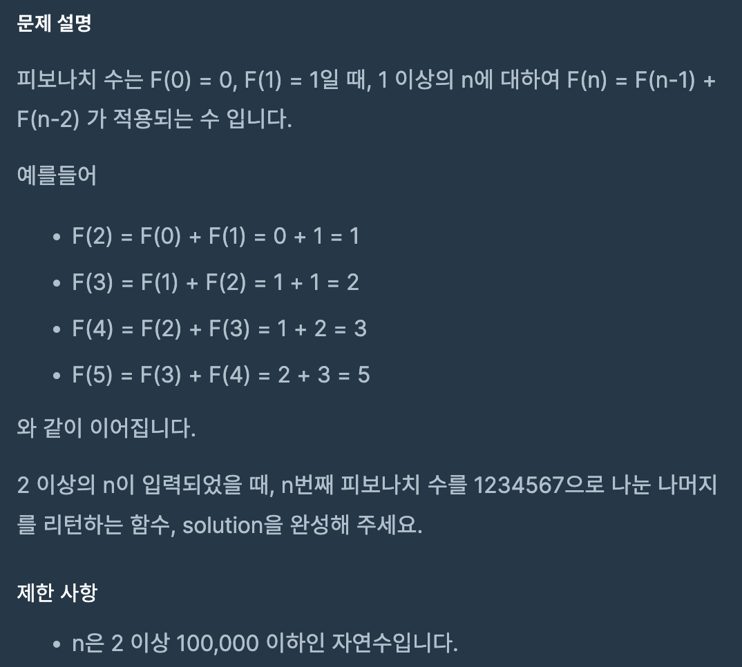 https://school.programmers.co.kr/learn/courses/30/lessons/12945 ํ๋ก๊ทธ๋๋จธ์ค์ฝ๋ ์ค์ฌ์ ๊ฐ๋ฐ์ ์ฑ์ฉ. ์คํ ๊ธฐ๋ฐ์ ํฌ์ง์ ๋งค์นญ. ํ๋ก๊ทธ๋๋จธ์ค์ ๊ฐ๋ฐ์ ๋ง์ถคํ ํ๋กํ์ ๋ฑ๋กํ๊ณ , ๋์ ๊ธฐ์ ๊ถํฉ์ด ์ ๋ง๋ ๊ธฐ์ ๋ค์ ๋งค์นญ ๋ฐ์ผ์ธ์.programmers.co.kr 1. ์ฌ๊ทํจ์(recursive)๋ก ํ๋ฉด ์ ๋ ฅ๊ฐ์ด ํด ๊ฒฝ์ฐ ๋ฉ๋ชจ๋ฆฌ์ฐจ์ง๋ฅผ ๋ง์ด ํ๊ณ ์๊ฐ๋ณต์ก๋๊ฐ ์ฆ๊ฐํ๋ค.2. ์ค๋ณต์ฐ์ฐ์ ์์ ๋ dynamic programming์ ํด์ผํ๋ค.3. ์ฒซ๋ฒ์งธ์ ๋๋ฒ์งธ ๊ฒฝ์ฐ๋ ๋ฏธ๋ฆฌ ๊ฐ์ ์ด๊ธฐํํ๊ณ ์์ํ๋ค.4. ์ค๋ฒํ๋ก์ฐ๋ฅผ ๋ฐฉ์งํ๊ธฐ ์ํด์ ๊ฐ ์ฐ์ฐ์ 1234567์ ๋๋จธ์ง ์ฐ์ฐ์ ํด์ผํ๋ค. ๋ด ํ์ดclass Solution { public int solution(i..