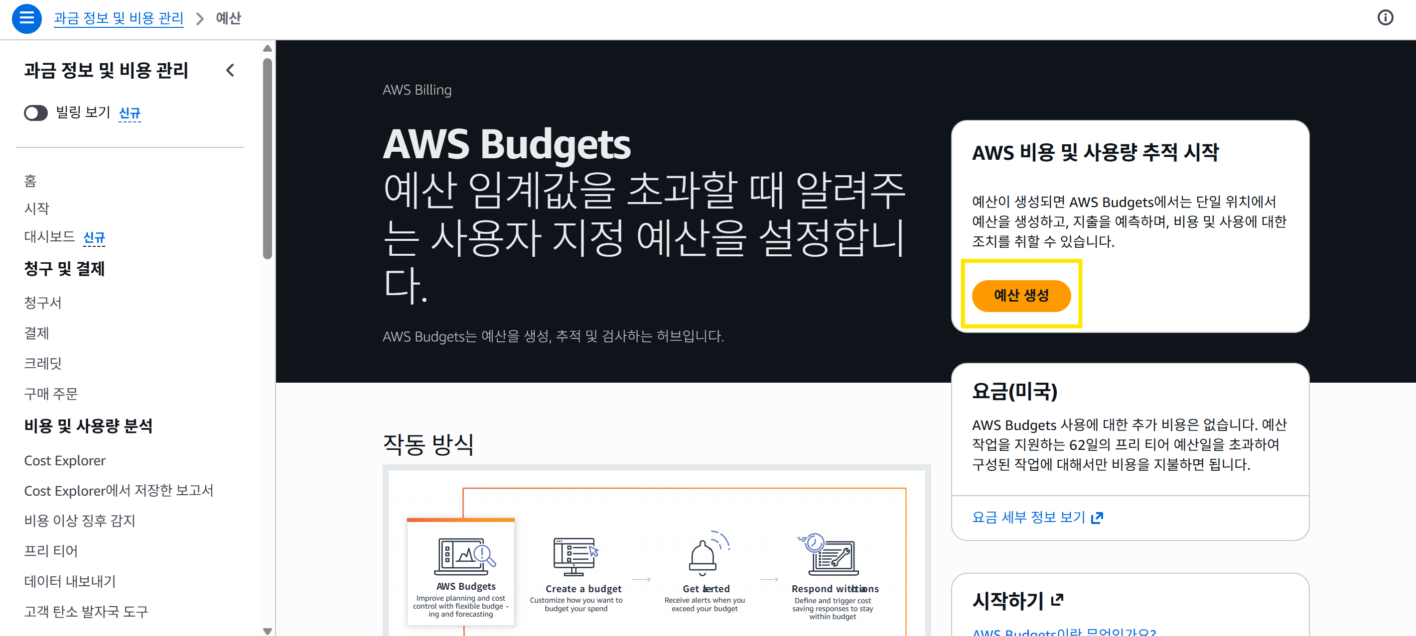1. AWS ํ ํ๋ฉด์์ - ๊ฒ์ - Budget ๊ฒ์